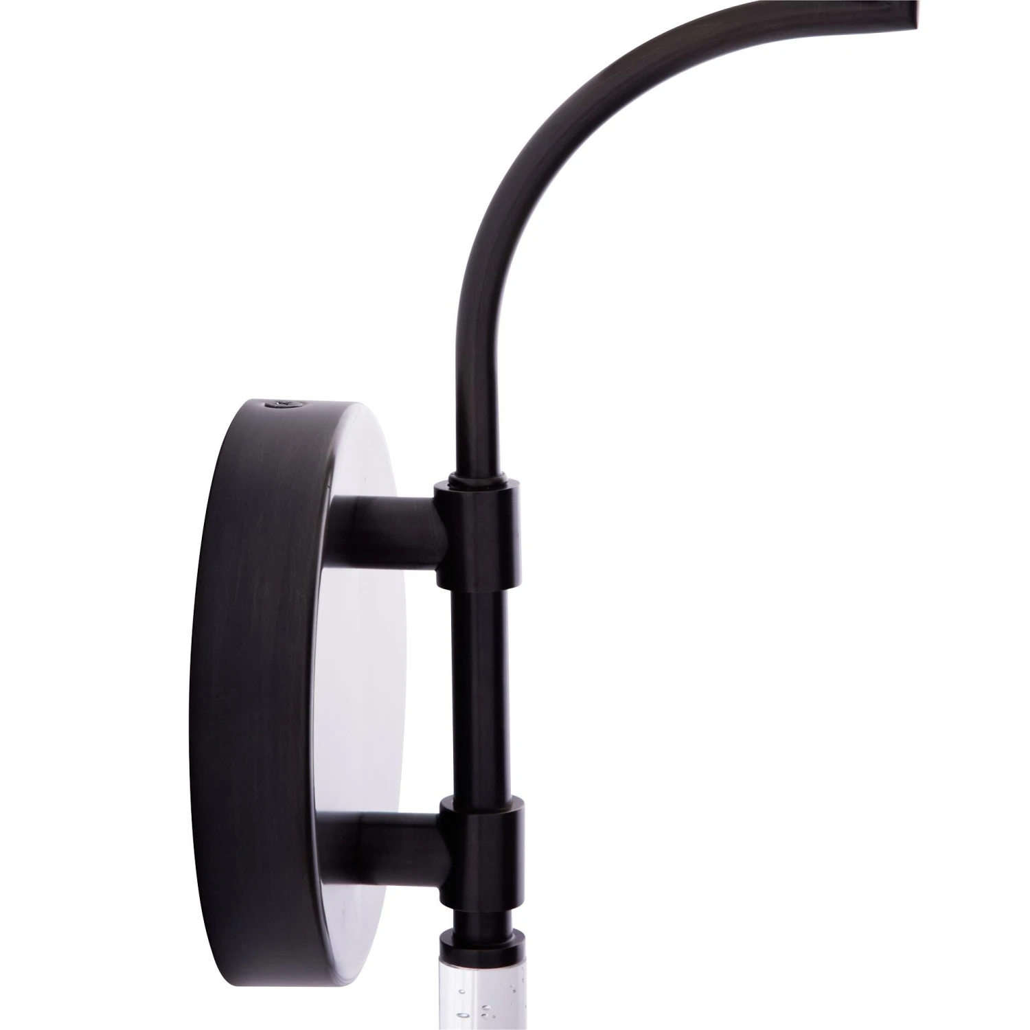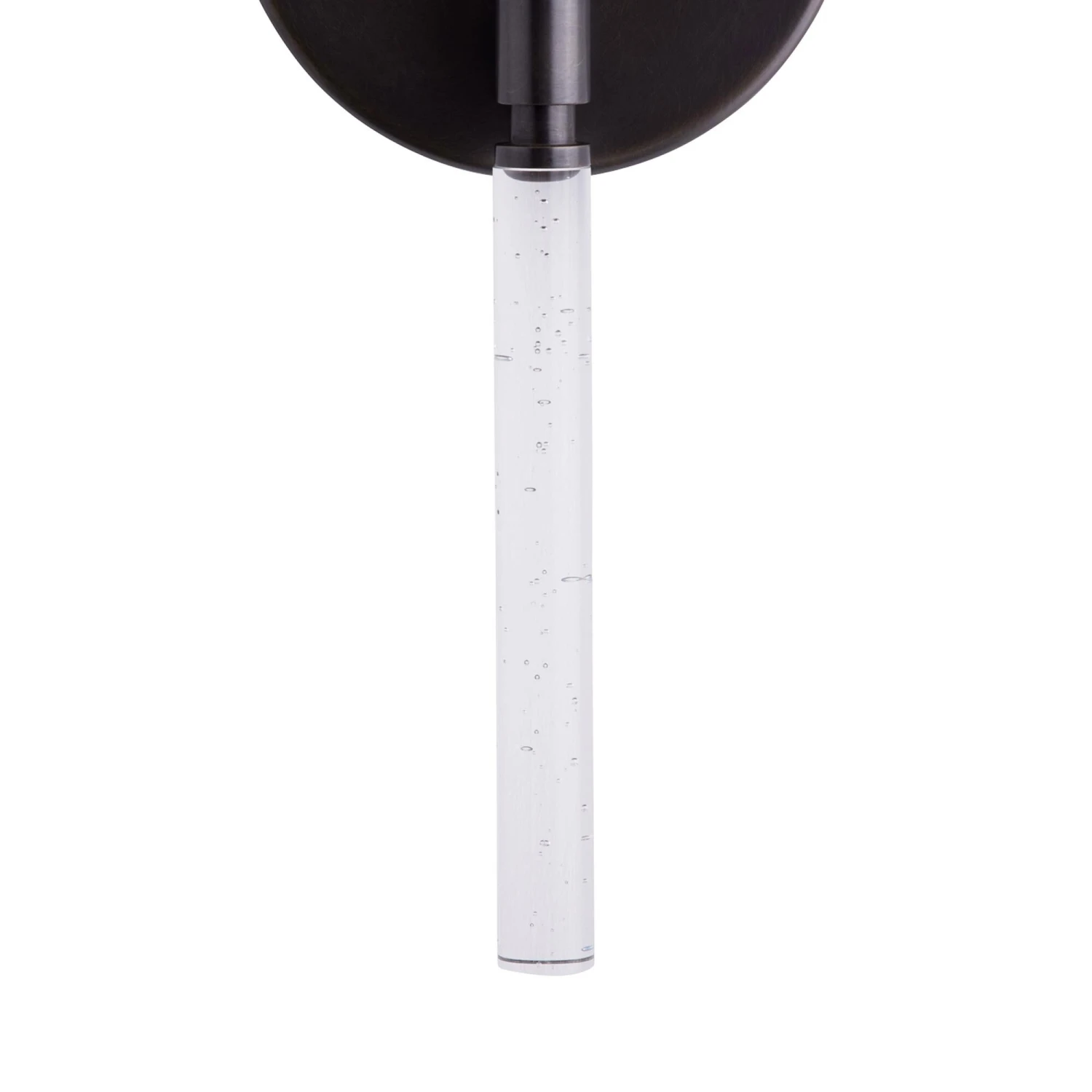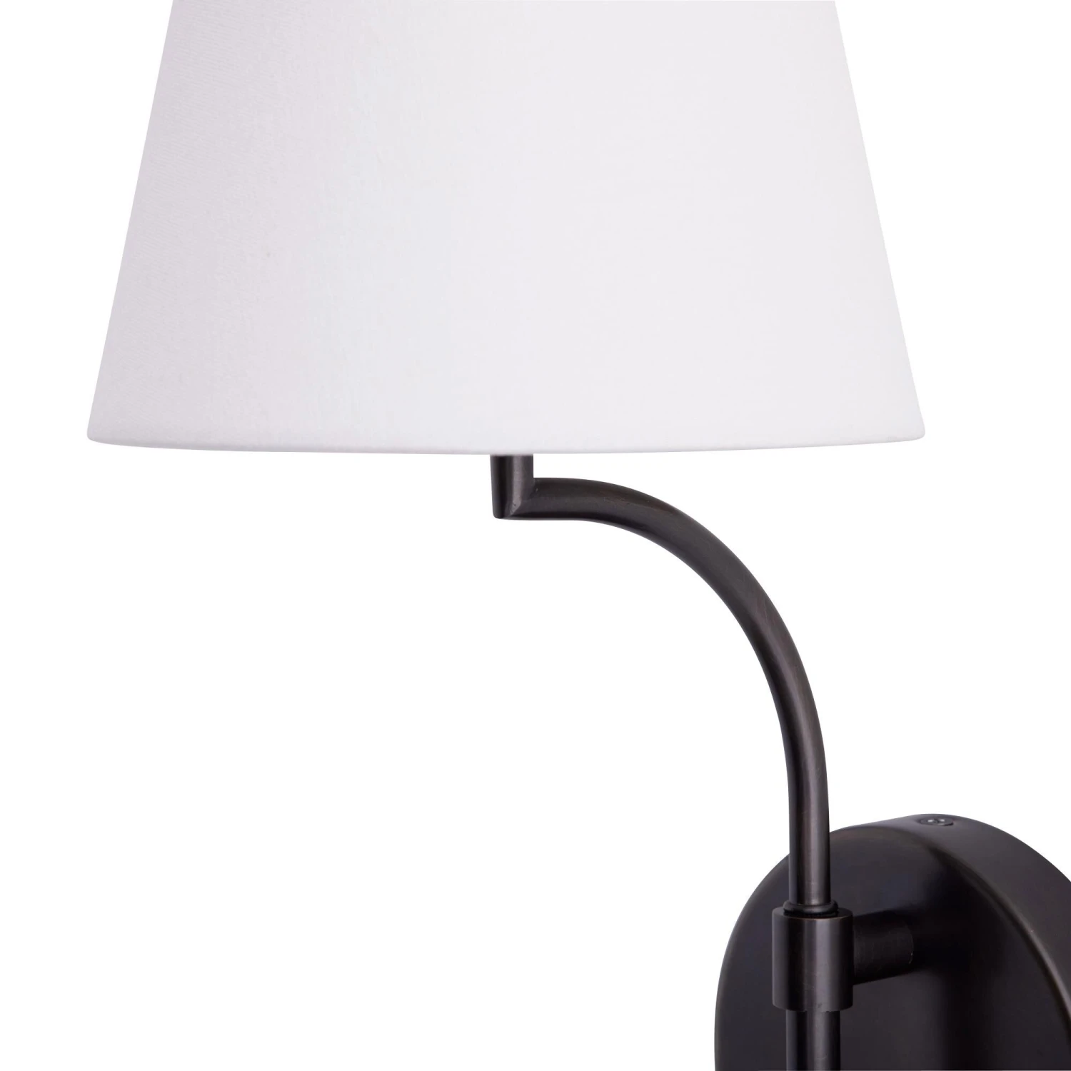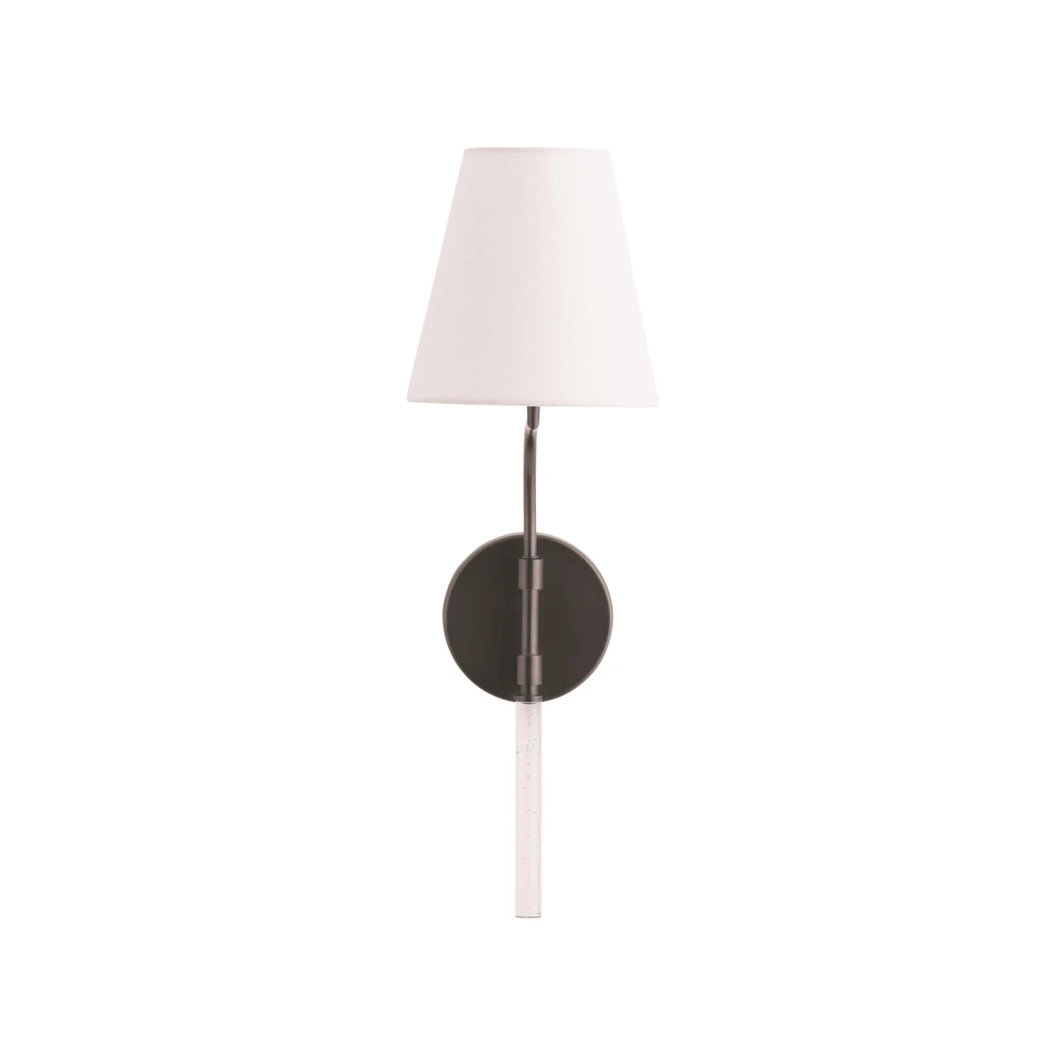 The traditional form and modern style of the McCoy redefines essential lighting. An English bronze steel foundation presents a clear seedy crystal finialelevating its contemporary design statusand is topped with a white linen shade. The finial extends from the bottom, working to capture and refract the light for extra illumination. Damp-rated, although limited covered outdoor areas may affect finish.