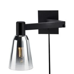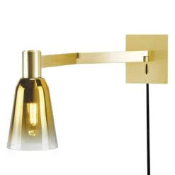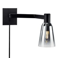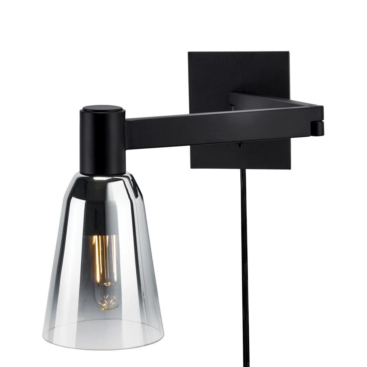 Inspired by the popular Carnival fixture; this adjustable swing-arm wall mount; with its voluptuous shade; fits easily into any interior. Product can be hard-wired or plugged in with a cord; the discreet on/off switch on the backplate lets the strong lines of the fixture take pride of place. Available in Aged Brass with Gold Chrome Glass Shade or Matte Black with Black to Clear Glass Shade.
