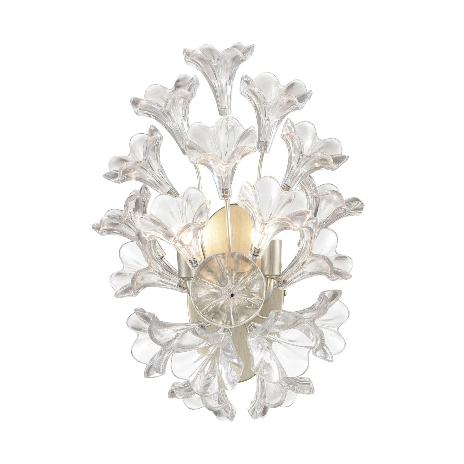 The Celene 2-Light Sconce Showcases Oversized Clear Glass Flowers Which Capture The Light To Create A Radiant Sprouting Bouquet. The Aged Silver Finish Compliments The Glass.