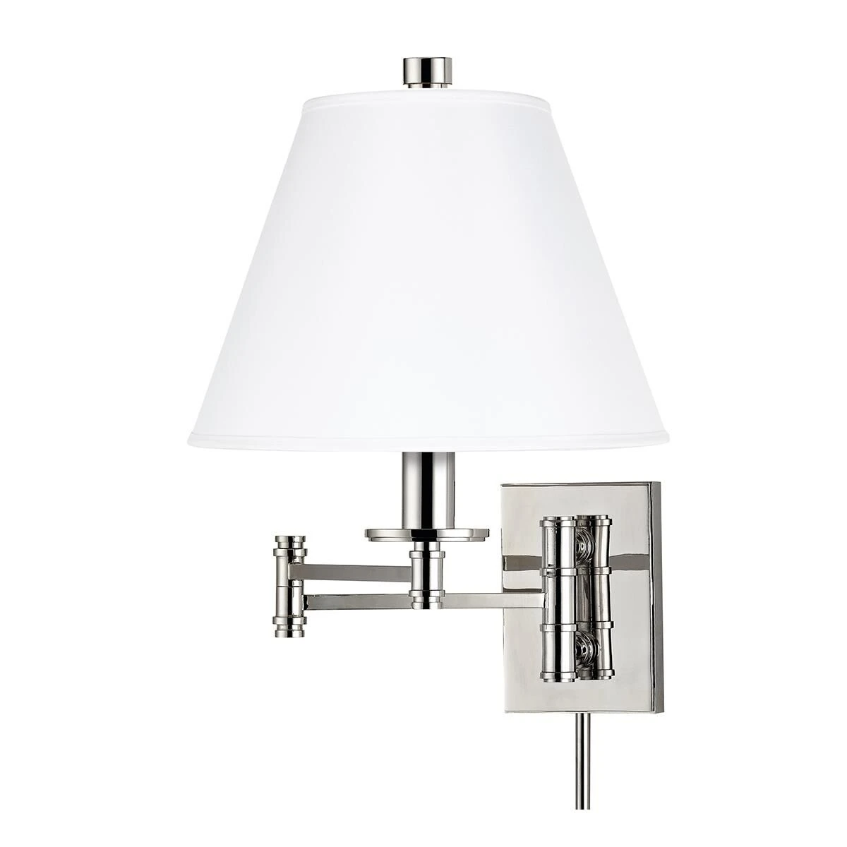 An English barrel shade caps the refined styling of the Claremont wall-mount, swing-arm lamp. Though unembellished, the candlestick and bobeche bulb base, as well as the ring details at the arm hinges, give the functional lamps a traditional feel. Claremont makes an ideal bedside reading lamp, without taking up any table space. Unlike typical wall sconces, Claremont comes wired with a standard, plug-in cord.