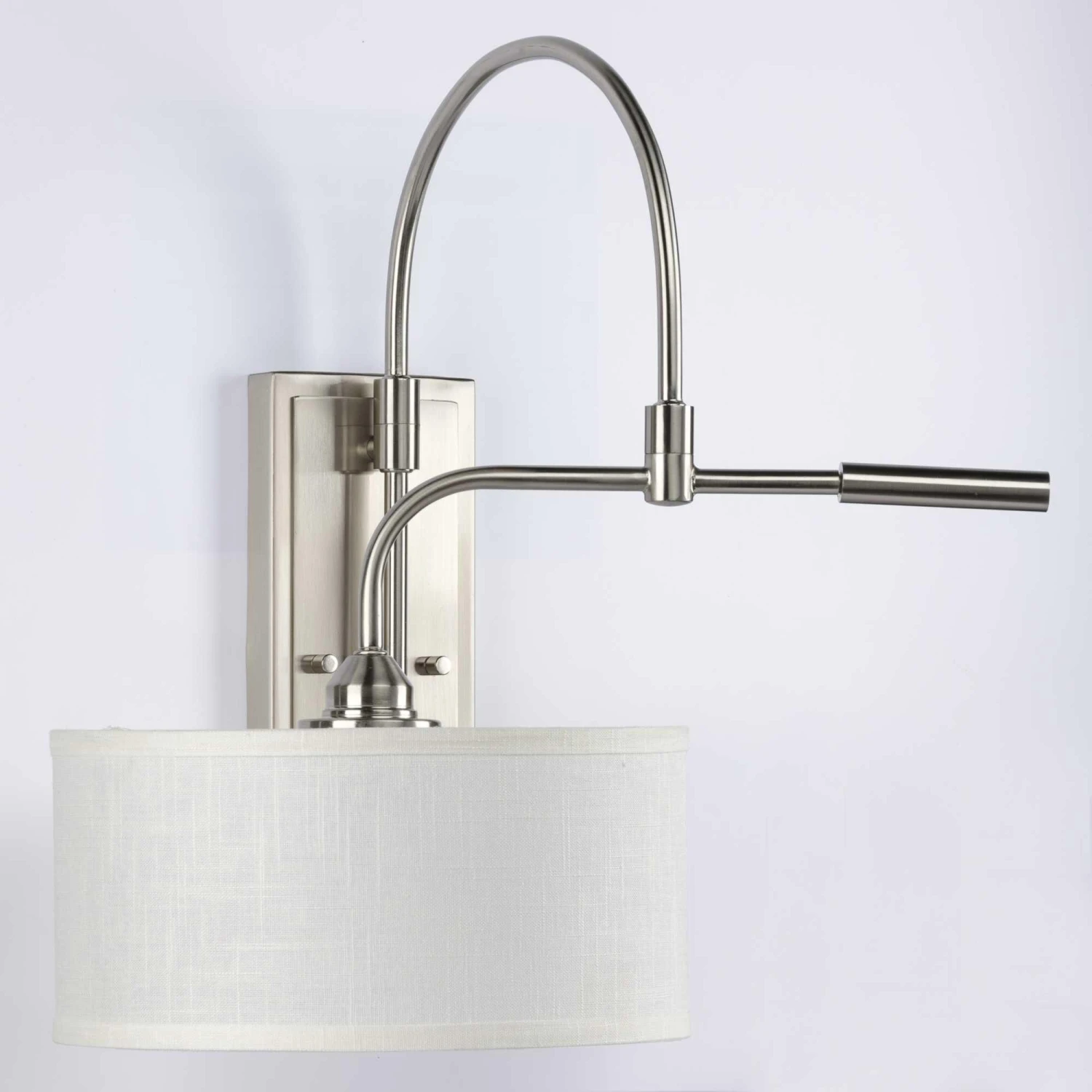 Kick back and relax within the pages of your favorite novel under the glow of the Kempsey one-light wall bracket. A smooth, arced arm extends from a rectangular backplate to hold the small, curved bar that supports a clean, Summer Linen shade. With an alluring Brushed Nickel finish, the fixture blends well with transitional and farmhouse interiors where it can provide focused task light while mounted to a wall in a bedroom, office, den, or living room.