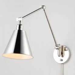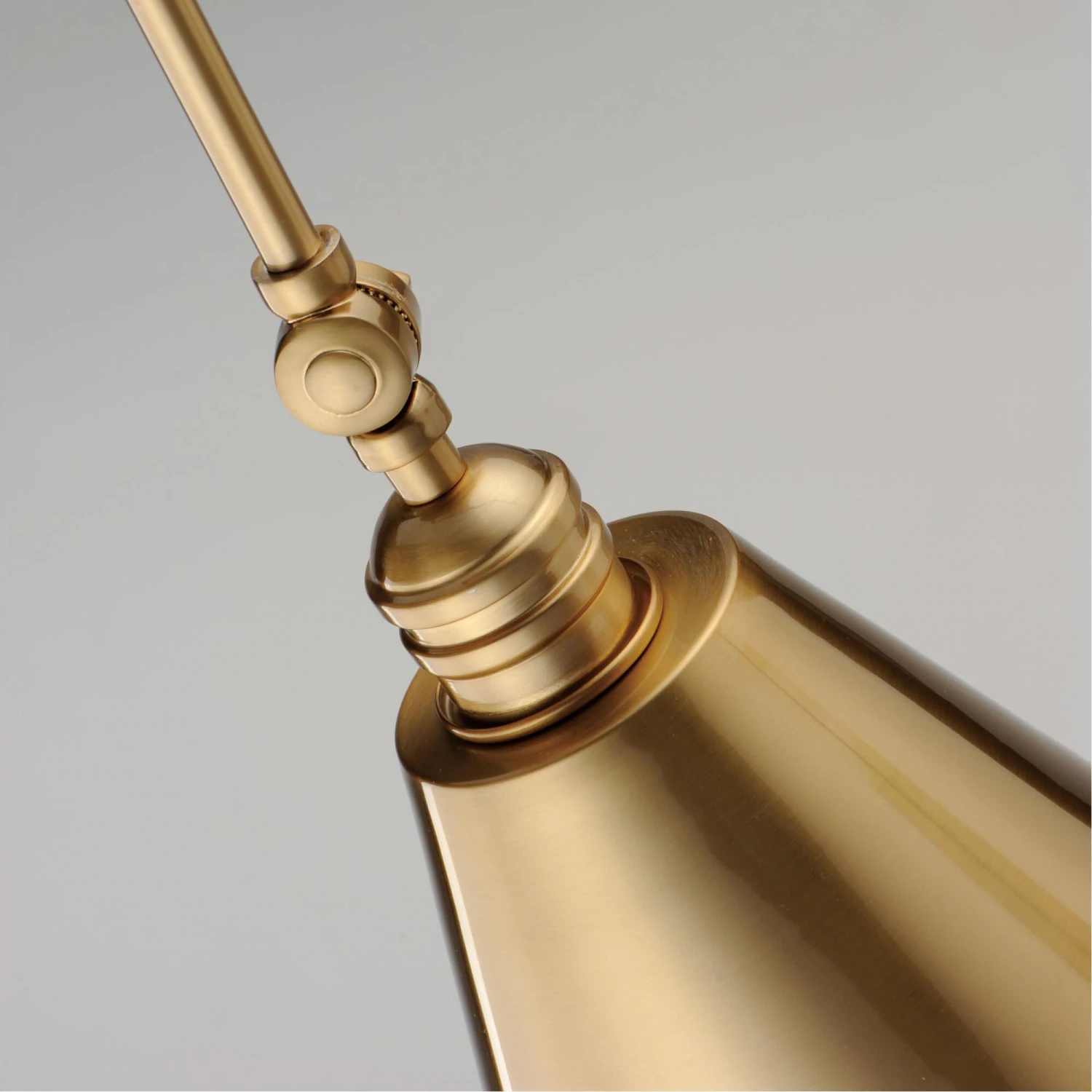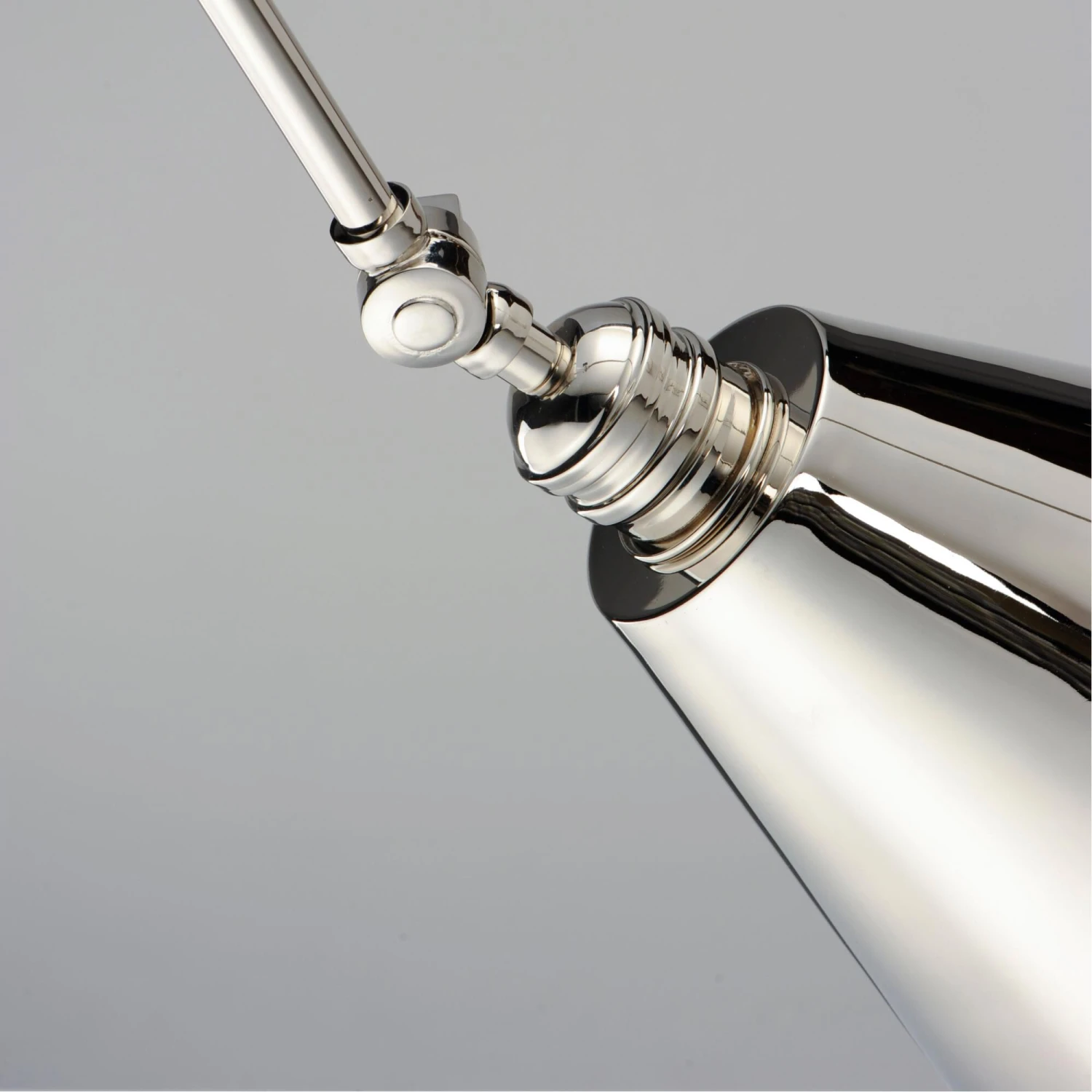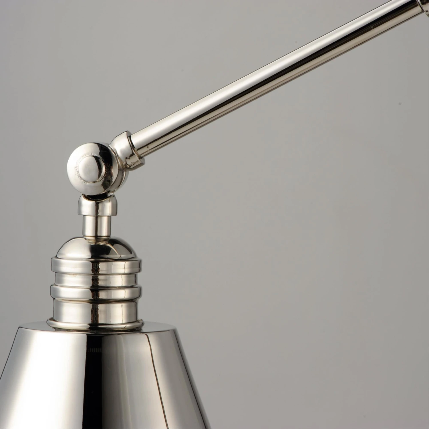 Direct the light exactly where you want it using the articulated arms and metal shades of the Library series. At the backplate, the arm pivots left/right and up/down to direct the light. Additional articulated arms angle the shade or extend/contract the distance of the light source from the wall. Available in Polished Nickel, Black and Heritage Brass finishes, the Library collection evokes industrial era classicism perfect for use as a task light or accent light. Complimentary table and floor lamps complete the collection.