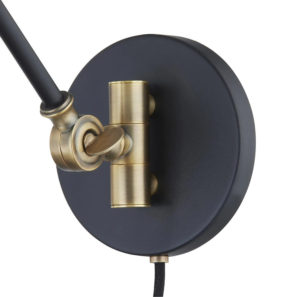 Navin’s slender Textured Black arms and tapered white-linen drum shades get an industrial-inspired upgrade with mechanical parts in Patina Brass. Both the arm and shade angles of the floor lamp, chandelier, and sconce are fully adjustable to provide customized lighting for any space.