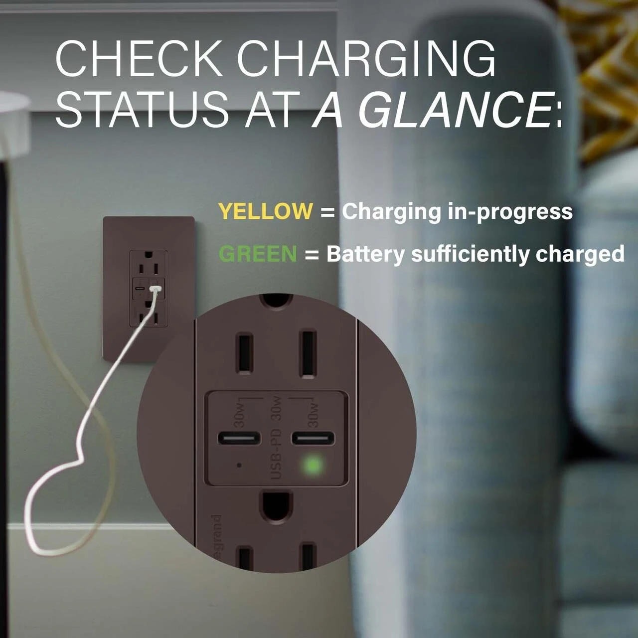 Charge devices up to 2X faster with the Ultra-Fast PLUS Power Delivery USB Outlet. Made to deliver a leading 30 Watts of power and featuring two built-in Type-C USB connections, this solution adds advanced Power Delivery to the industry-leading amperage of our Ultra-Fast line. The result is a faster, future-proof option for convenient in-wall charging, specially designed to optimize performance for your Power Delivery-enabled devices. Easily replace a traditional outlet in as little as ten minutes to gain the modern functionality of intelligent charging for maximized speeds, complete with multi-layered overcurrent protection to keep the outlet and your devices safe from damage.